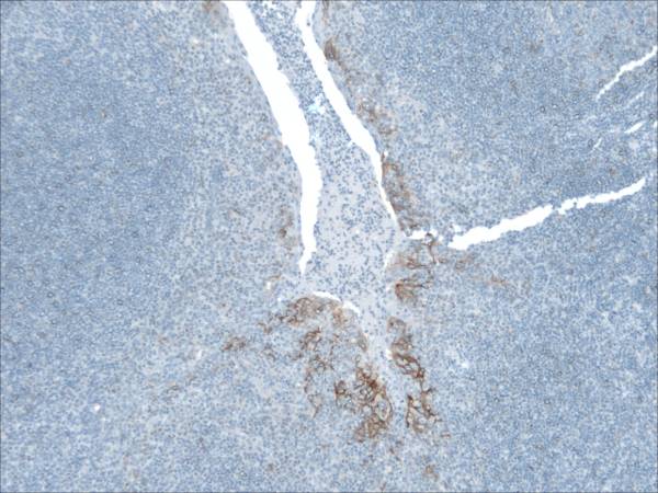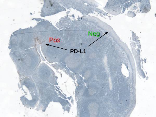 At low magnification (Left), one sees the heterogeneous expression of PDL1 in a tonsil which is used as a preferred positive on-slide control for PDL1. This expression is explained by a focal invasion of T cells reaching an infectious area (Center: DAB: CD3, RED: Cytokeratin). The T cells release Interferon-Gamma which stimulates local expression of PDL1 by the epithelium. The right picture shows PDL1 expression at higher magnification.