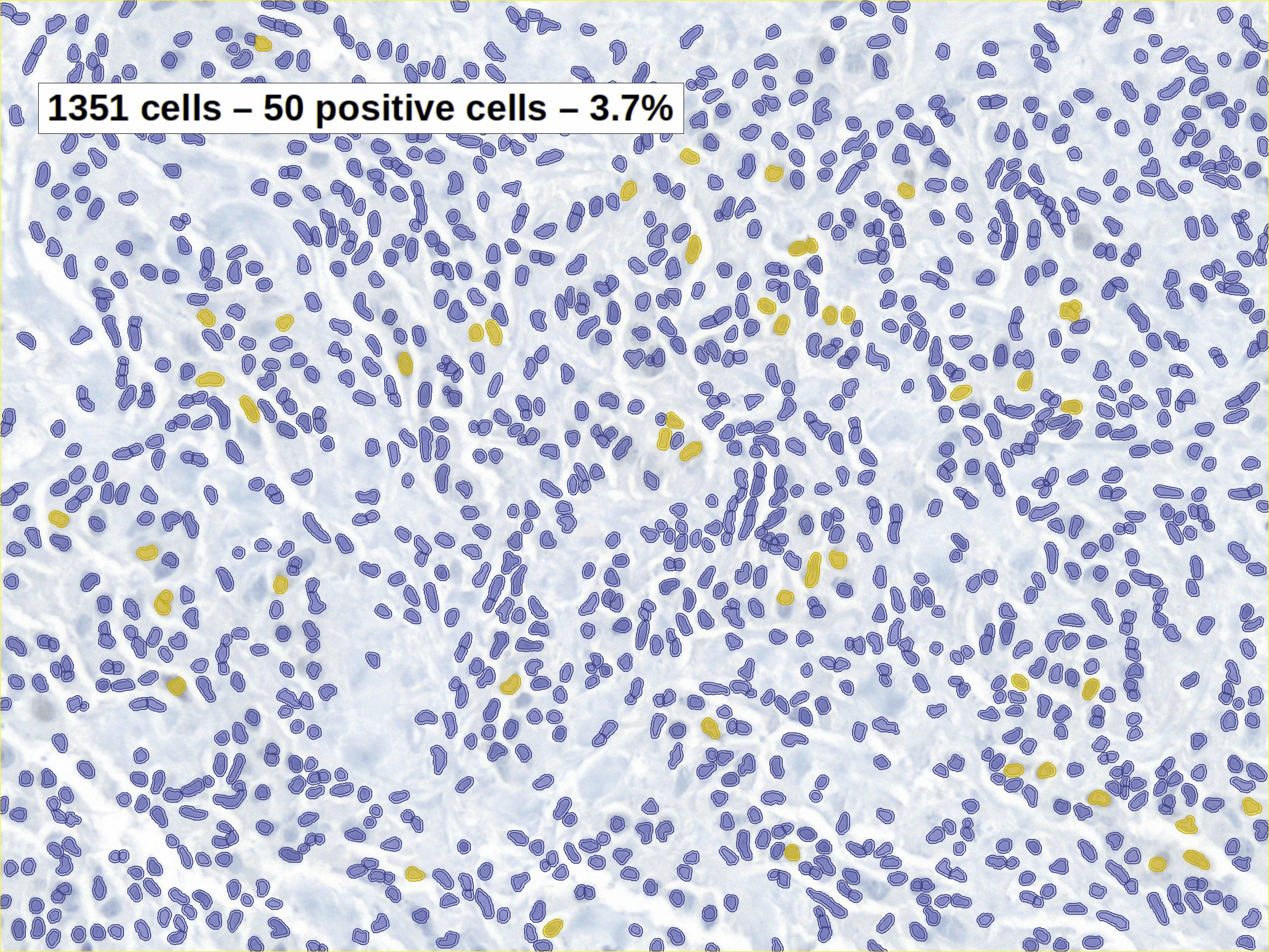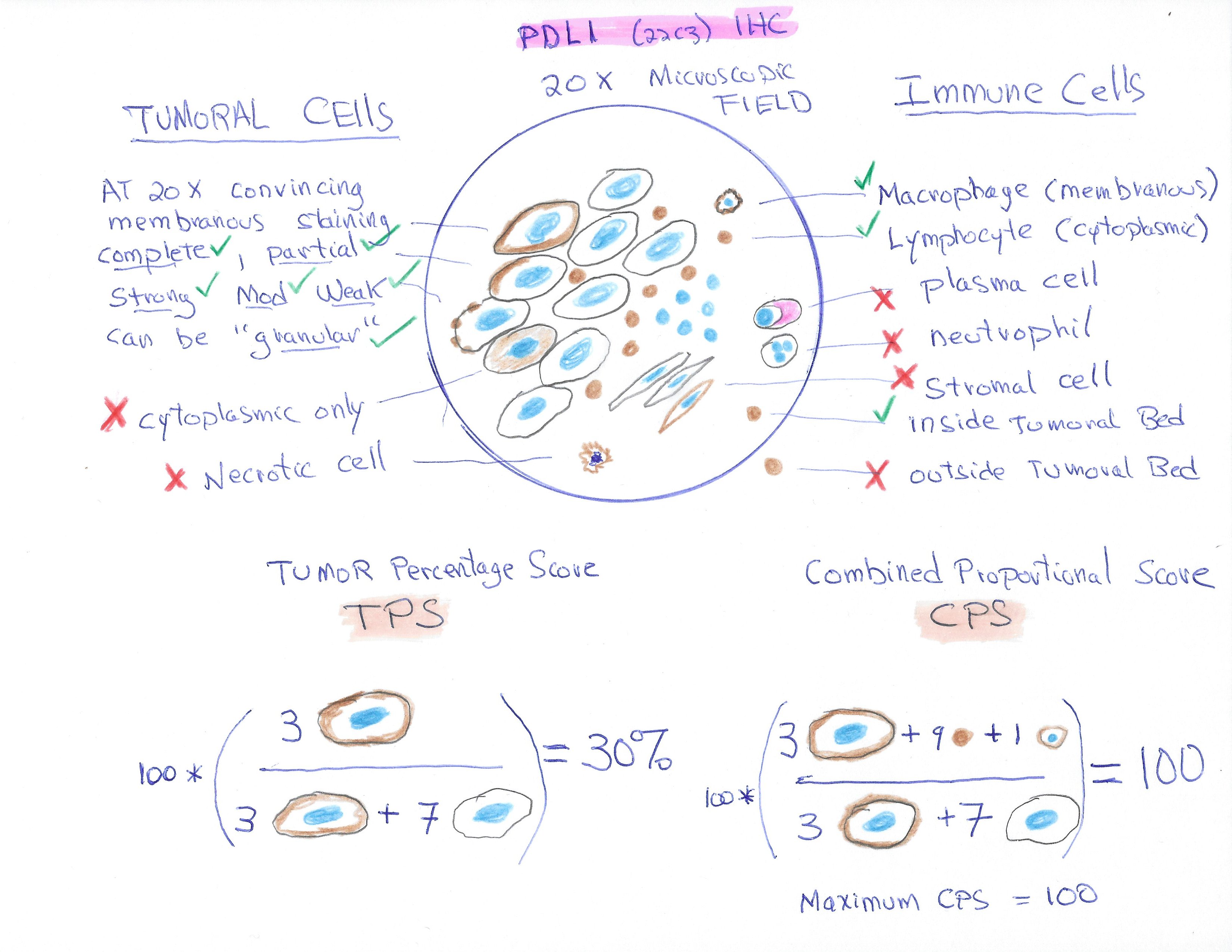 Assessing either TPS and CPS is not straightforward. Different scenario are encountered which trigger different strategies to properly assessed this PDL1 biomarker. Here are examples of scenario Estimating the number of cells in a microscopic field is not easy as demonstrated below (it represents a picture of breast cancer with some weakly ER positive nuclei). An open source software developed with FIJI is available to estimate the number of cells from a picture taken from your camera. A video is available to explain how to use it. https://github.com/gilbertbigras/PDL1-CPS-Denominator.