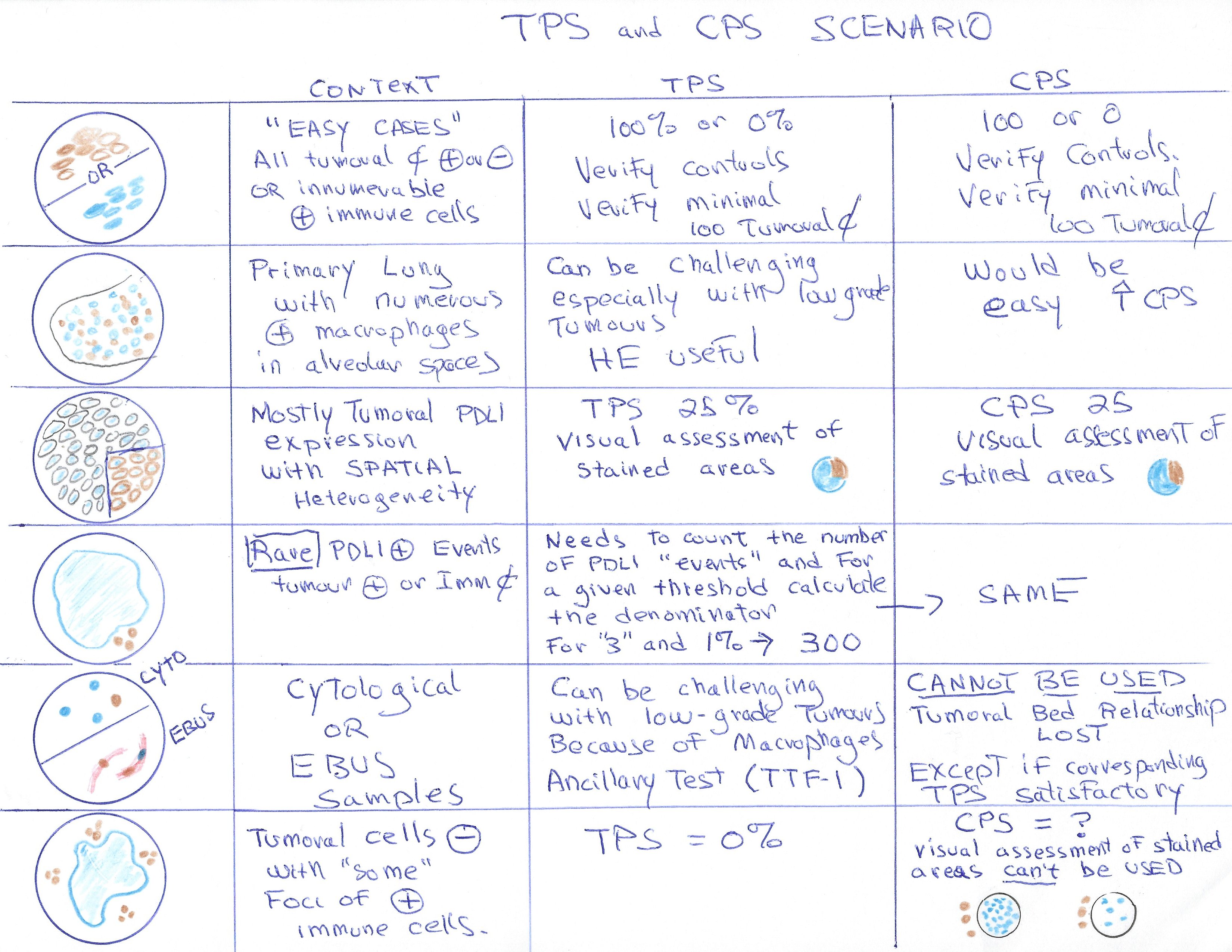 CPS and TPS are quite different in their approaches. Regarding the assessment TPS, one challenge is the detection of weakly stained tumoural cells. Sometimes a subset will be strongly positive and can sidetrack our focus from another weakly stained subset. Immune cells must be ignored in the TPS assessment and sometimes macrophages mimic tumoral cells and one has to review the associated H&E. CPS has different challenge. While TPS can be estimated from visual assessment of stained vs non-stained proportions, this is not possible for CPS. Indeed the “area” of immune positive cells and the “area” of tumour are de-correlated in term of cellularity.